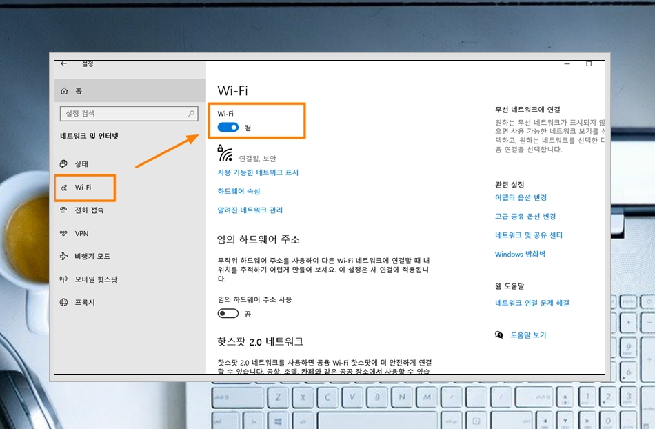 2. 새롭게 열린 창에서 좌측에 있는 Wi-Fi를 클릭해 보세요. 무선인터넷 연결이 안된다면 Wi-Fi 부분에 "꺼짐"으로 되어 있을 수 있어요. 해당 부분을 클릭하여 "켬"으로 변경해 주세요.