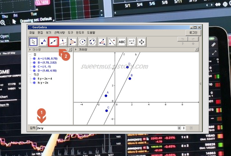 ①번 창에 수식을 입력하고 엔터키를 누르면 바로 직선이 그려진답니다.