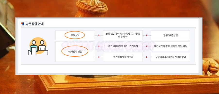 7. 방문을 하는 경우에는 예약을 하고 갈 수도 있고, 예약 없이 방문을 할 수도 있어요. 인구가 밀집된 지역에 있는 센터를 방문하는 경우에는 대기 시간이 길어질 수 있어요. 법률상담도 10분 정도 밖에 할 수 없고요.