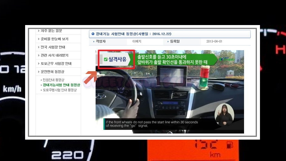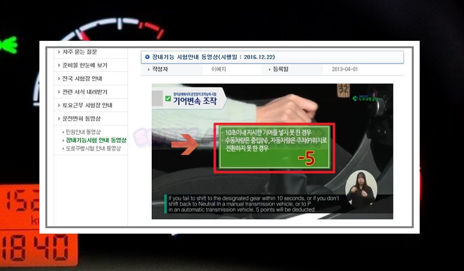 운전 동영상에는 합격기준 외에도 실격사유, 감점사유, 조작 순서 및 방법을 알려줍니다.