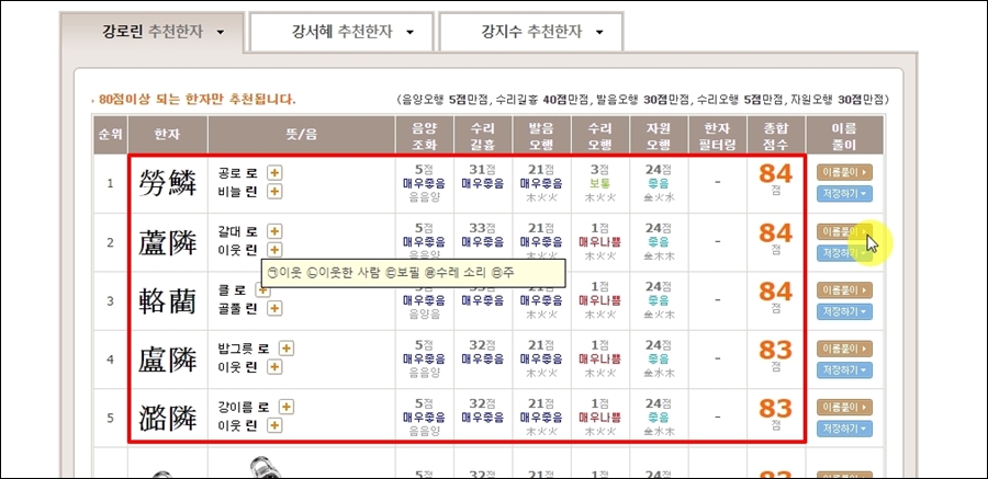 그럼 위와 같이 성명학 기준으로 80점 이상이 되는 한자를 추천 받을 수 있어요.