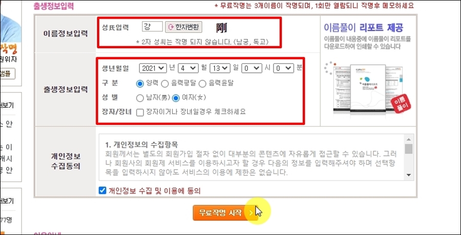 그럼 강씨 이름을 짓기 위해 무료 작명 서비스를 이용해 볼게요.