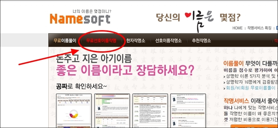 1회에 한하여 무료 이용이 가능한데요. 메뉴에서 "무료 선호 이름 작명"을 클릭해 주세요.