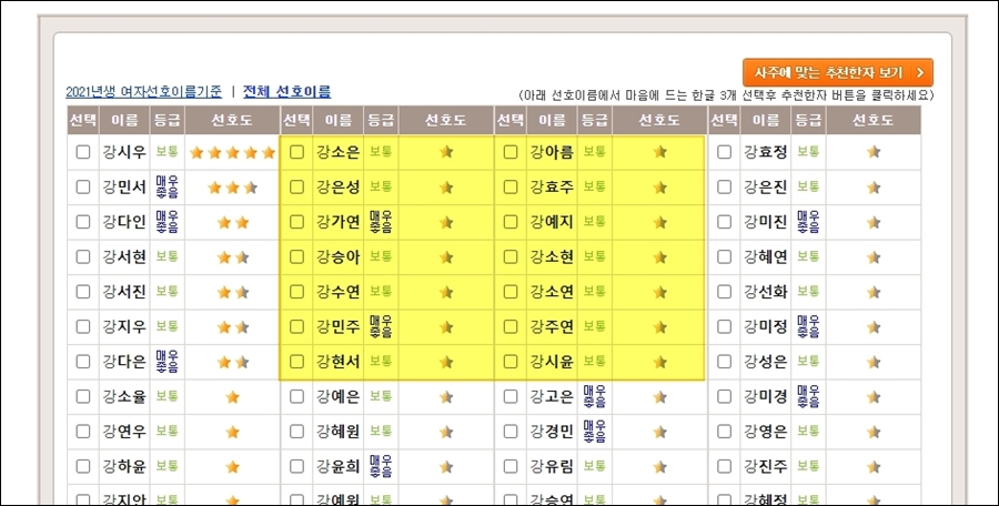 마음에 드는 성명을 3개 선택한 후 "사주에 맞는 추천한자 보기" 버튼을 클릭해 보세요.