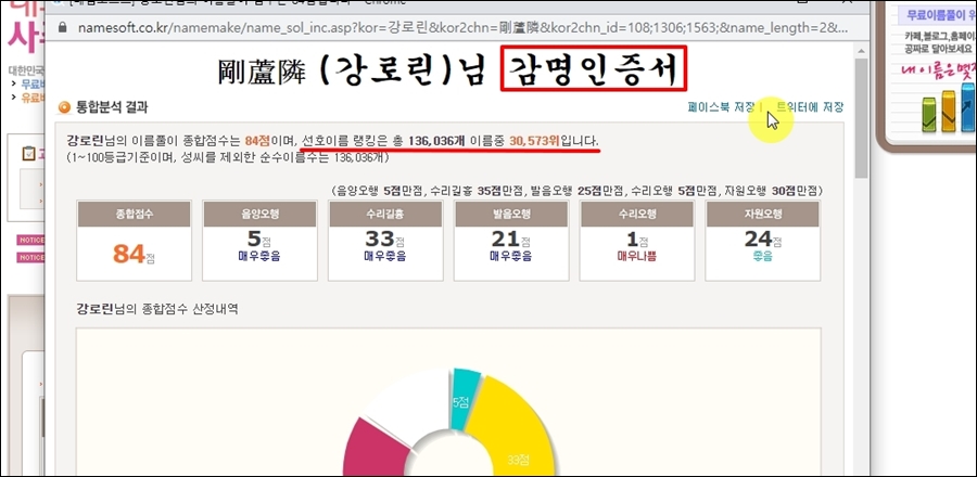 풀이 버튼을 누르면 감명인증서 페이지가 열리는데요. 여기에서 자신이 선택한 이름에 대한 선호도 순위를 확인할 수 있어요.