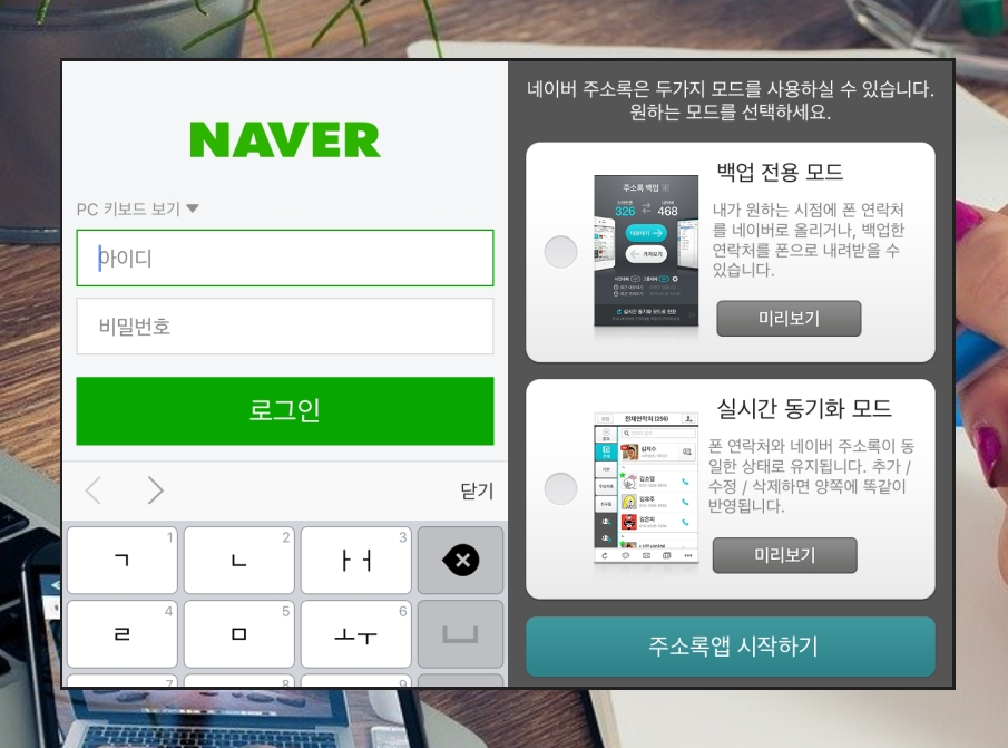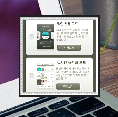 네이버 주소록 앱은 2가지 모드를 제공하고 있습니다. 백업 전용 모드와 실시간 동기화 모드인데요.