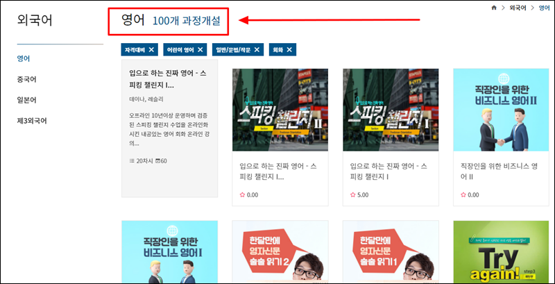 영어공부를 할 때 이곳에서 이용할 수 있는 과정만 100개에요. 한 과정당 여러 차시의 강의로 구성되어 있는데요. 그만큼 영어공부를 위한 학습 콘텐츠가 넘쳐나요. 여기 있는 강좌만 이용해도 충분히 혼자서 영어 실력을 향상 시킬 수 있어요.