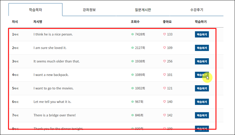 학습 목차 탭을 클릭해 보세요. 그럼 듣고 싶은 차시만 바로 공부하는 것도 가능해요. 조회수를 보면 아시겠지만, 많은 사람들이 이용했어요.