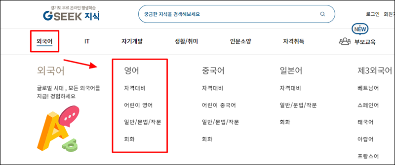 경기도 무료 온라인 평생학습 사이트에 접속했어요. 이곳에서는 영어 외에도 중국어, 일본어, 베트남어 등에 대한 학습을 혼자하기 가능하도록 여러 과정을 마련해 놓고 있어요. 여기에 더하여 IT, 자기개발, 생활, 취미, 자격증, 인문소양 부분에 있어서도 혼자 공부하기 가능하도록 콘텐츠를 제공하고 있죠.