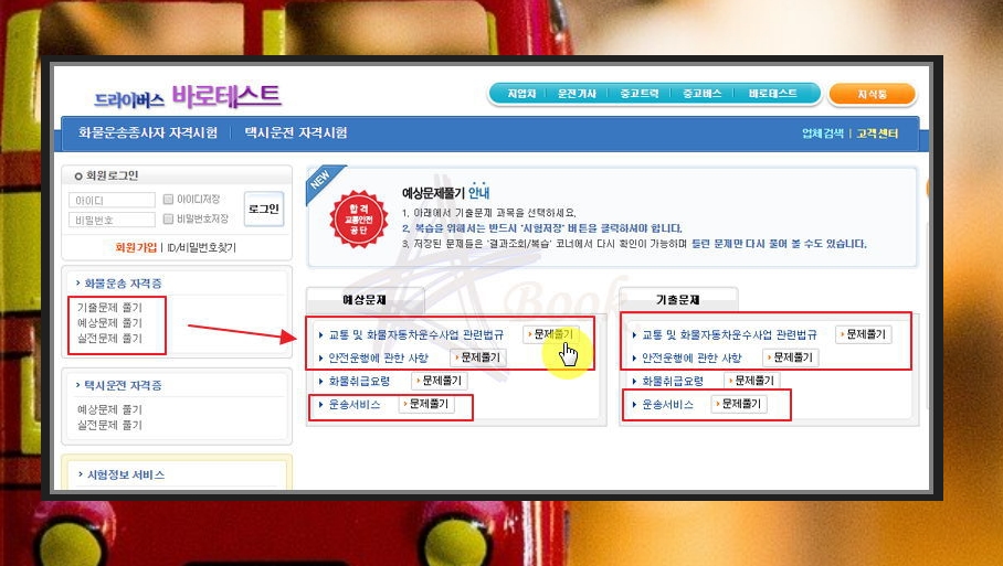 좌측에 보시면 화물운송 자격증이 있고, 그 아래 기출문제 풀기가 있습니다. 클릭하시면 좀 전에 봤던 버스운전자격시험의 과목과 겹치지요? '화물취급요령'을 제외하고 나머지 과목의 기출문제의 '문제풀기' 버튼을 누르시면 됩니다.