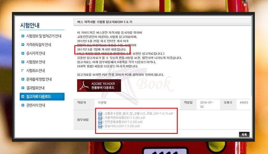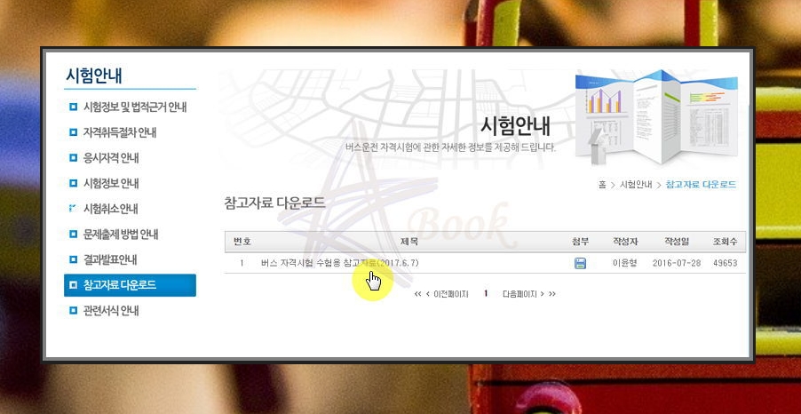 '버스 자격시험 수험용 참고자료'가 보이시나요? 2017년 6월 7일에 새로 등록이 되었는데요. 이번에 응시하실 계획이라면 새롭게 등록된 자료를 꼭 이용하셔야 합니다.