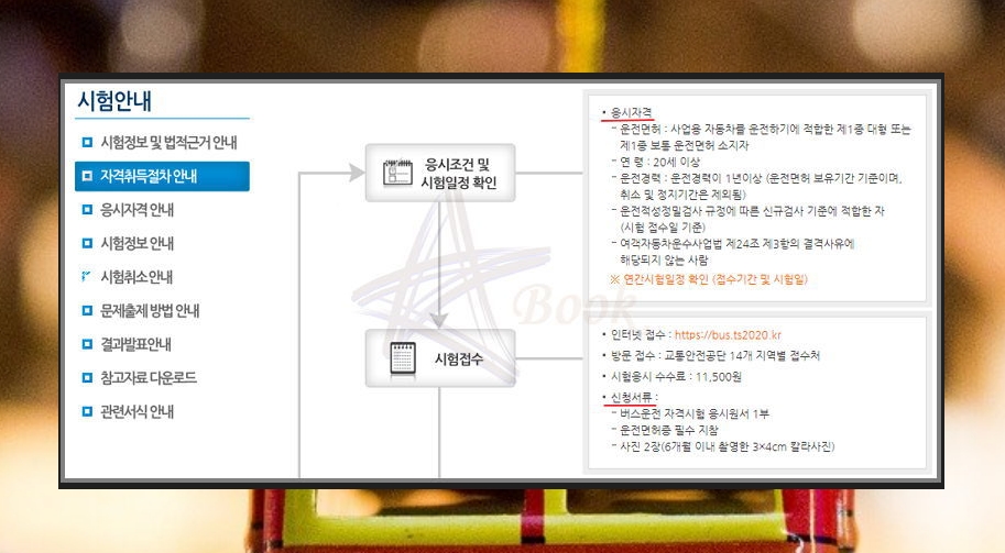 기본적으로 응시를 하려면 몇 가지 조건에 부합되셔야 합니다. 1종 대형이나 보통의 면허를 소지하고 있으셔야 하고, 운전경력 1년 이상, 나이는 20세 이상 등이 되어야 하는데요. 수수료와 준비물도 필요하오니 참고하시길 바랍니다.