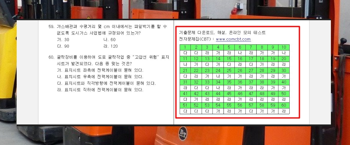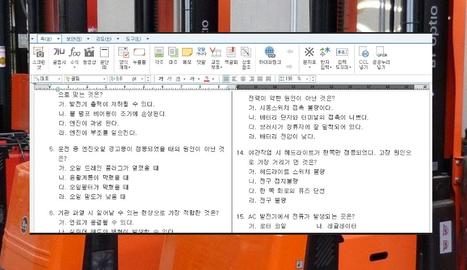 아쉽게도 가장 최근에 출제된 지게차 필기 기출문제는 없습니다. 몇 년 전에 시행된 지게차 운전기능사 시험 자료만 있는데요. 괜찮습니다. 그때나 지금이나 크게 변한 건 없거든요. 필기 시험은 생각보다 어렵지 않답니다. 정말 중요한 것은 실기 시험이죠. 그만큼 어렵기도 하고요.