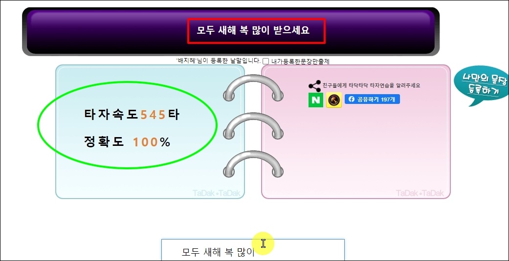 단어까지 빠르고 정확하게 칠 수 있다면 이번에는 문장연습을 진행하면 됩니다. 문장을 입력할 때에 무조건 정확도를 100% 유지하도록 해야 합니다. 오타가 나는 것을 무시하고, 연습을 하게 되면 나중에 고치기 어려워집니다. 빠르게 쳐도 오타가 나오면 말짱 도루묵이에요.