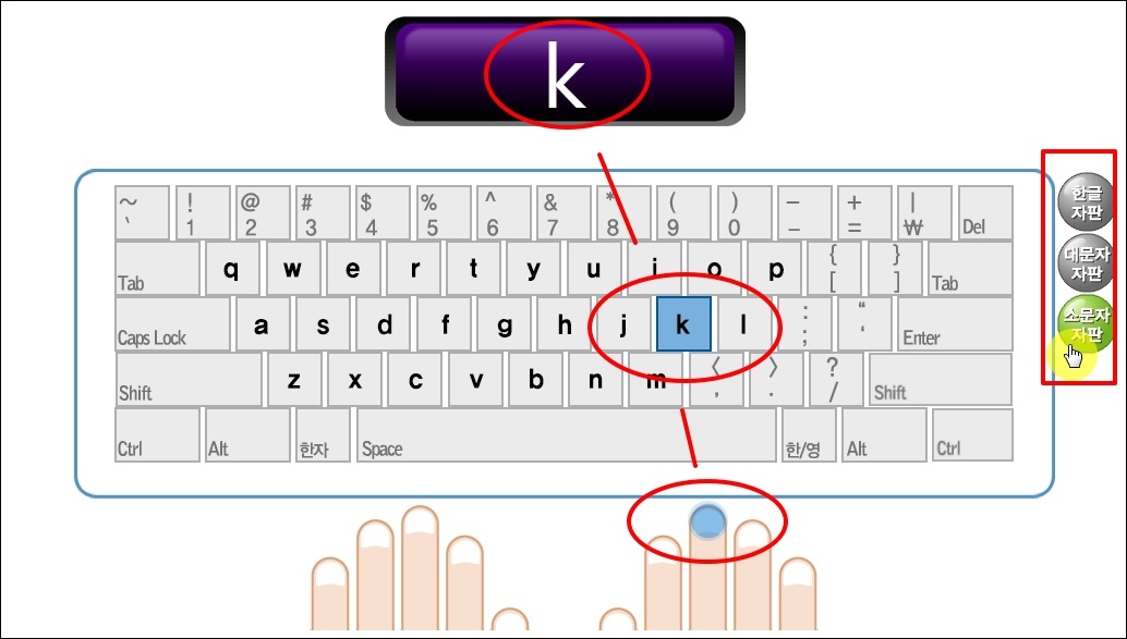 컴퓨터를 사용하면서 생각보다 영어 사용을 많이 하게 됩니다. 그렇기 때문에 화면 우측에 있는 영어 대문자 및 소문자 자판 버튼을 눌러 영어를 입력하는 연습도 함께 해주세요.
