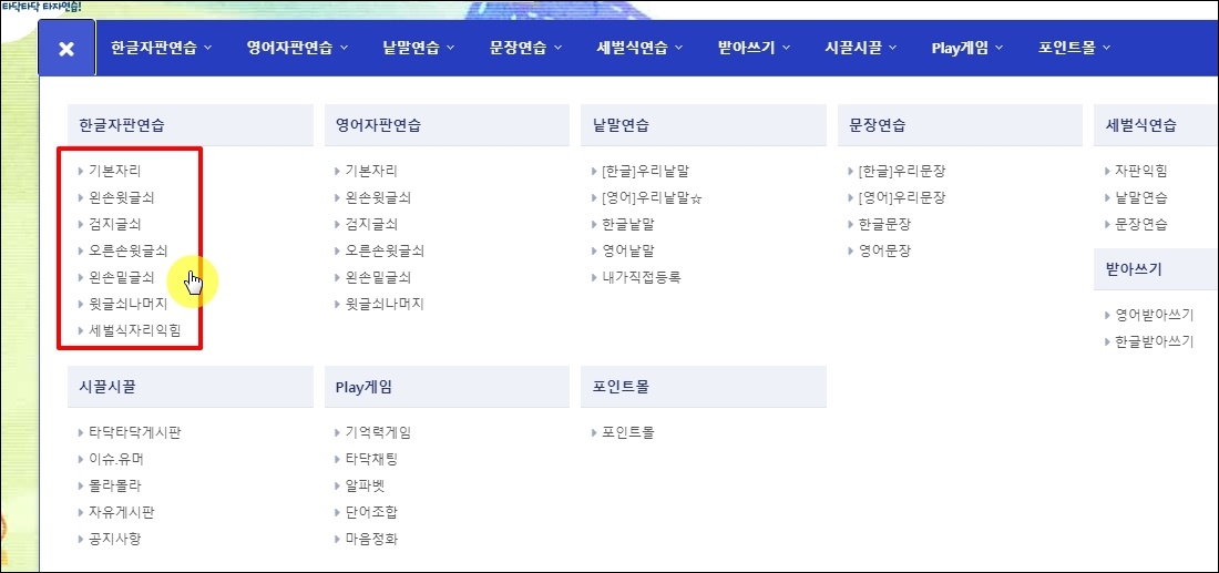 사이트에 접속하면 여러 가지 종류의 서비스를 확인할 수 있습니다. 연습 과정에는 크게 4가지로 구분이 되어 있습니다. 한글과 영문 자판, 낱말, 문장 입니다. 처음 컴퓨터를 배우는 사람이라면 맨 좌측에 있는 기본자리 부터 먼저 익히면 됩니다.