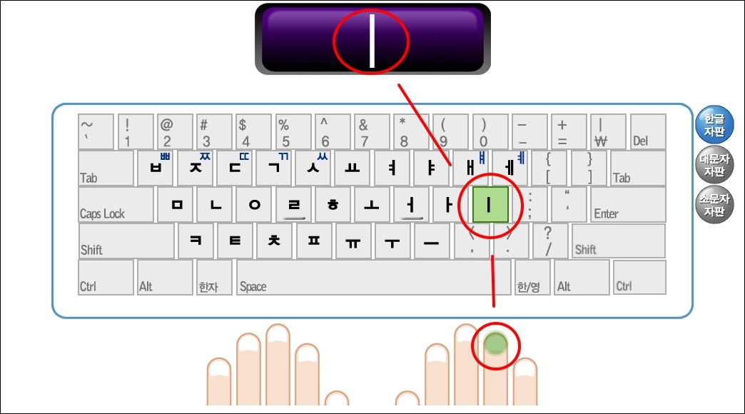 기본자리 익히는 것은 간단합니다. 화면에 나온 자음 또는 모음을 보고, 정확한 손가락으로 컴퓨터 키보드에 있는 키를 누르면 됩니다.