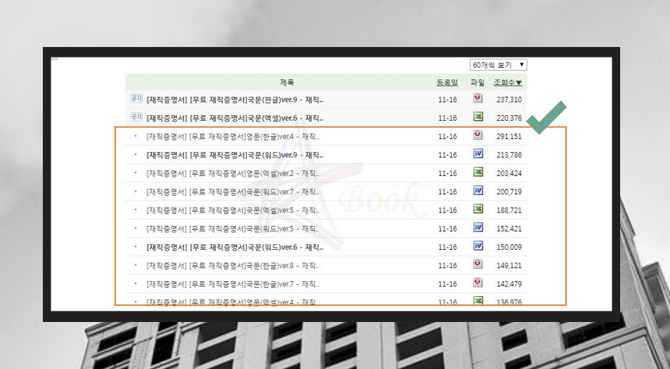 회사마다 사용하는 오피스 프로그램이 다른데요. 아래아 한글, 마이크로소프트 엑셀, 워드용 문서가 마련되어 있습니다. 다양한 무료 재직증명서 양식이 나타났는데요. 어떤 것을 선택해야 할지 헷갈리는 경우 조회수를 클릭해 보세요. 가장 많이 이용되는 서식을 찾으실 수 있습니다.