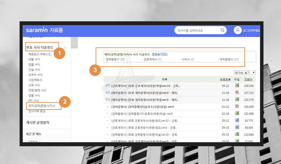사람인 사이트에서 재직증명서 무료 양식 다운을 받을 때에는 따로 로그인을 요구하지 않습니다. 회원 가입을 하지 않아도 받을 수 있는 자료에요. 채용에 관련된 일을 하거나 구직 중이라면 가입을 한 적이 있겠지만, 그렇지 않은 경우에는 굳이 자료를 받기 위해 가입하실 필요는 없습니다.