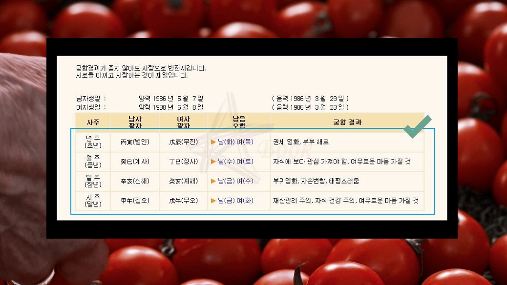 두 사람이 함께 하면서 초년, 중년, 장년, 말년에 어떤 결과가 나오는지 알려주는데요. 서로의 팔자가 두 사람의 운명에 영향을 준다고 해요. 결과에 나와 있듯이 어떤 좋은 일이 있는지, 어떤 마음 가짐으로 살아야 할지 알 수 있어요.