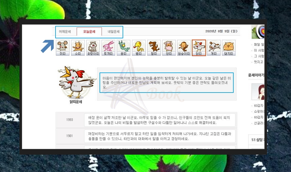 오늘의 띠별운세를 클릭해 보세요. 그럼 이렇게 어제, 오늘, 내일에 어떤 운이 들어오는지 알아볼 수 있는데요. 오늘 어떤 좋은 일이 있는지 알려주고, 무엇을 해야 더 많은 운이 다가오게 할 수 있는지 알려줘요.