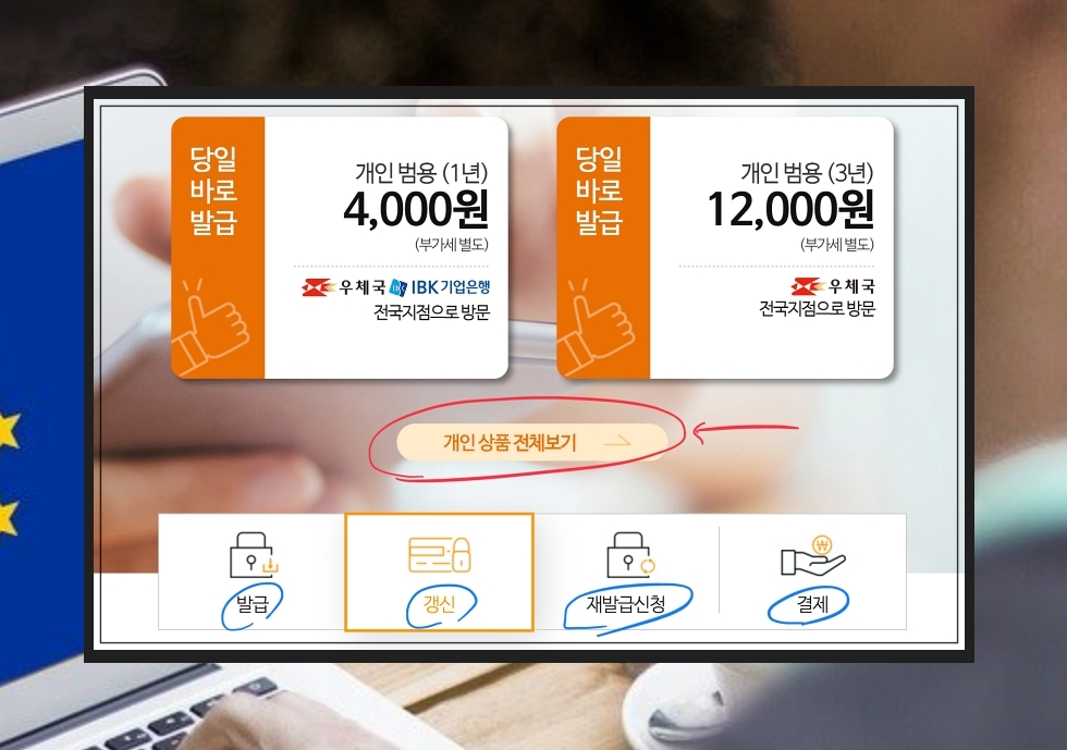 여기서 공인인증서를 신청하면 당일 바로 발급 받아 사용이 가능한데요. 우체국이나 기업은행에 서류를 제출하러 가야 하기 때문에 해당 지점이 열려있는 시간에 진행할 때 가능합니다. 하나의 인증서로 인터넷에서 진행하는 대부분의 용도로 사용하고 싶을 때 범용 버전을 사용해야 하는데요. 1년 동안 사용할 때 부가세 별도로 4000원의 비용이 발생합니다. 좀 더 저렴한 것을 찾는다면 "개인 상품 전체보기"를 클릭해 주세요.