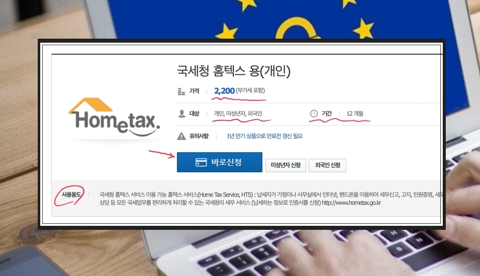 돋보기 버튼을 클릭하면 선택한 것에 대해 좀 더 자세히 살펴볼 수 있는데요. 국세청 홈텍스 전용의 경우 부가세 포함해서 1년에 2,200원입니다. 사용용도를 꼼꼼히 살펴보시고, 해당 용도로만 사용하신다면 해당 인증서를 선택하는 것도 좋아요. 인터넷 상에서 바로 발급을 진행하고 싶다면 "바로신청" 버튼을 클릭해 주세요.
