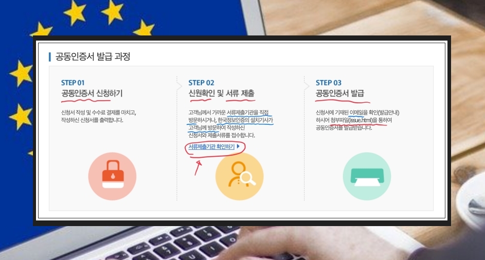 신청서를 작성하기 이전에 전체적인 공인인증서 발급 과정을 알려드리겠습니다. 첫번째는 방금 이용한 사이트에서 신청서를 작성하고, 수수료를 결제해야 해요. 두 번째로는 서류를 제출해야 하는데요. 앞서 언급한 우체국과 기업은행 지점에 가서 필요한 서류를 제출하면 됩니다. 집 밖에 나갈 수 없는 경우에는 설치기사 방문을 요청하면 됩니다. 서류를 제출한 이후에는 이메일을 하나 받게 되는데요. 해당 이메일을 통해 발급 진행을 완료하면 됩니다.