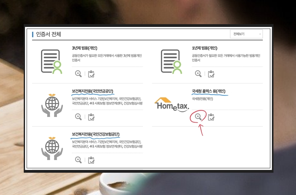 새롭게 열린 페이지를 보면 범용을 포함하여 이곳에서 인터넷으로 발급 신청을 할 수 있는 상품이 여러 개 나타나는데요. 국세청 홈택스를 사용하기 위해 발급을 받으신다면 홈텍스 전용을 추천 드립니다. 범용보다 이용료가 저렴해요.