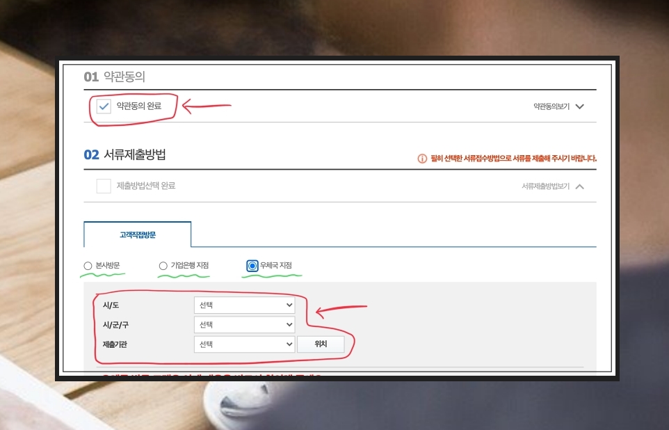 앞서 뒤로 미룬 신청서 작성에 대해 살펴보겠습니다. 공인인증서를 인터넷으로 신청하는 것은 정말 쉽습니다. 사이트에서 나타난 약관에 동의하고, 서류제출를 하기 위해 방문할 곳을 선택합니다.