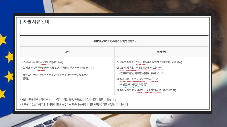 제출해야 하는 서류는 많지 않습니다. 신청서 1부와 식별 가능한 신분증 앞면 사본 1부면 충분합니다. 미성년자의 경우에는 법정대리인에 관련된 서류가 필요하니 참고해 주세요.