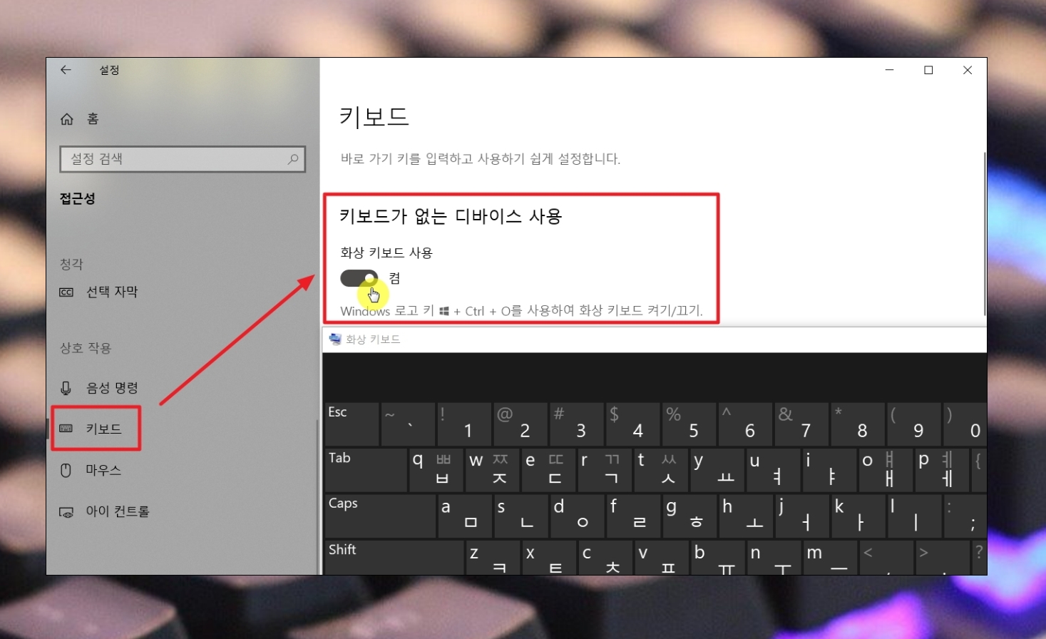 접근성 페이지가 열리면 좌측에 있는 메뉴에서 [상호 작용] 카테고리에 있는 [키보드]를 선택합니다. 메뉴 상에서 [화상 키보드 사용] 기능이 나타납니다. 해당 기능을 켜주면 다음과 같이 마우스 클릭으로 키 입력을 할 수 있습니다.