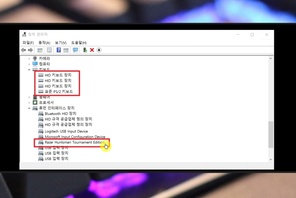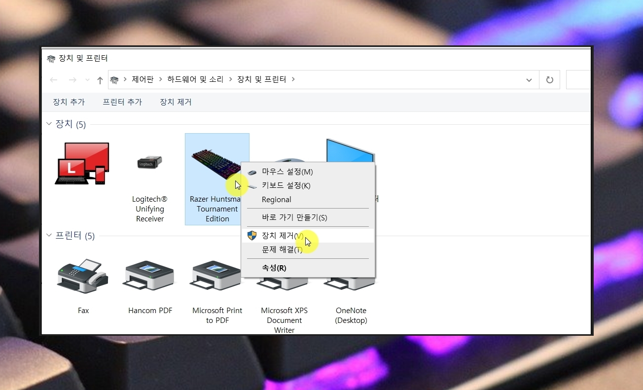 [장치 및 프린터] 페이지에 우리가 찾는 아이콘이 나타나지 않거나 이전 단계를 진행했음에도 여전히 입력이 안될때 장치 관리차를 켜주세요. 장치 관리자 페이지에서 [키보드] 카테고리와 [휴먼 인터페이스 장치]에 있는 "관련 장치"를 제거해줍니다. 그 다음 다시 재부팅을 하면 문제가 해결될 것입니다.