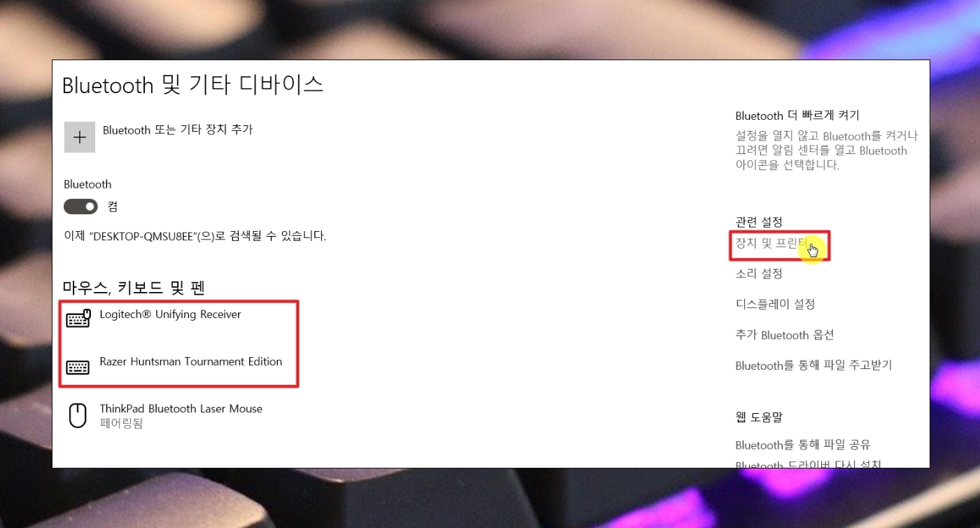 블루투스로 연결된 키보드가 안될때 [Bluetooth 또는 기타 장치 추가] 버튼을 눌러서 재등록을 할 수 있습니다. 등록이 되지 않거나 블루투스를 사용하는 경우가 아니라면 화면 우측에 있는 [장치 및 프린터]를 선택해 주세요.
