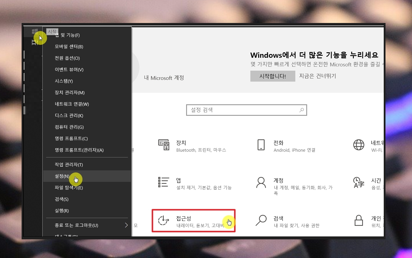 문제가 발생하면 가장 먼저 해야 할 일은 "화상 키보드" 작동을 시켜야 합니다. 그럼 키보드 없이도 마우스로 문자나 펑션키 등을 입력할 수 있습니다. 문제를 해결할 때 키 입력이 필요한 경우가 있기 때문에 우선적으로 해줘야 과정입니다. 간단하게 해당 기능을 사용할 수 있는데요. 윈도우 [시작] 버튼에 마우스 우클릭을 한 후 [설정]으로 들어갑니다. 그럼 제어판이 열리는데, 여기에서 [접근성]을 선택해 줍니다.
