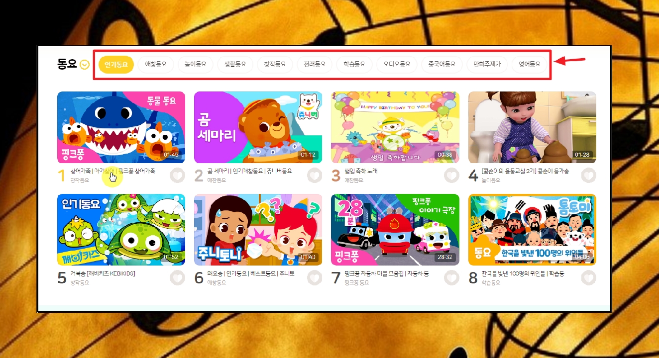 엄청나게 많은 동요를 무한대로 연속듣기 또는 시간을 정해서 연속듣기 할 수 있습니다. 영상도 나오기 때문에 어린이가 시청하기에도 정말 좋죠. 자막도 나오니까 글자를 읽을 줄 아는 아이라면 따라 부르기에도 좋습니다. 장르 또한 엄청 많은데요. 어떻게 이용하는지 간단히 알려드릴게요.