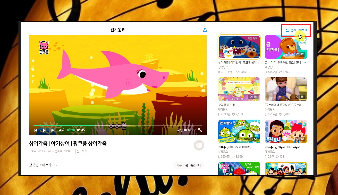 저는 "상어가족"이라는 동요를 선택했는데요. 여기서 보면 사이트 우측 상단에 [전체 이어보기] 버튼이 배치되어 있는 것을 알 수 있어요. 이 버튼을 누르면 하나의 곡을 계속 연속듣기 하거나 여러 가지 곡을 돌아가며 연속으로 재생하게 만들 수 있어요. 반대로 하나의 곡이 끝나면 재생을 멈추게 할 수도 있죠.