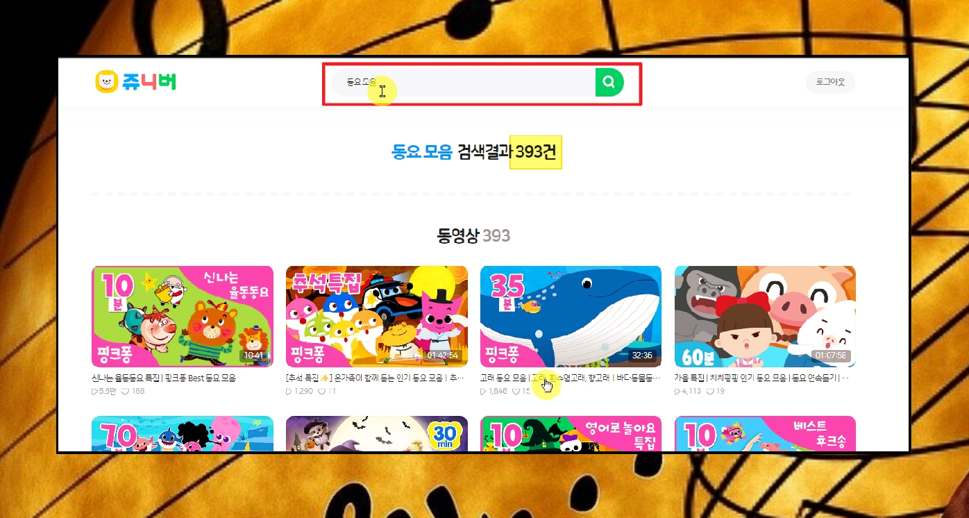 시간을 정해서 어린이 동요를 듣는 방법을 알려드릴게요. 쥬니버 사이트에서 검색창에 "동요 모음"을 입력한 후 엔터키를 눌러보세요. 그럼 393건의 곡이 나타나는데요. 이 모음들은 여러 가지 곡을 묶어 놓은 것을 의미해요. 썸네일 이미지를 보면 몇 분 동안 재생이 되는지 알 수 있어요. 해당 시간 동안 연속듣기 하고 싶을 때 사용하면 돼요.