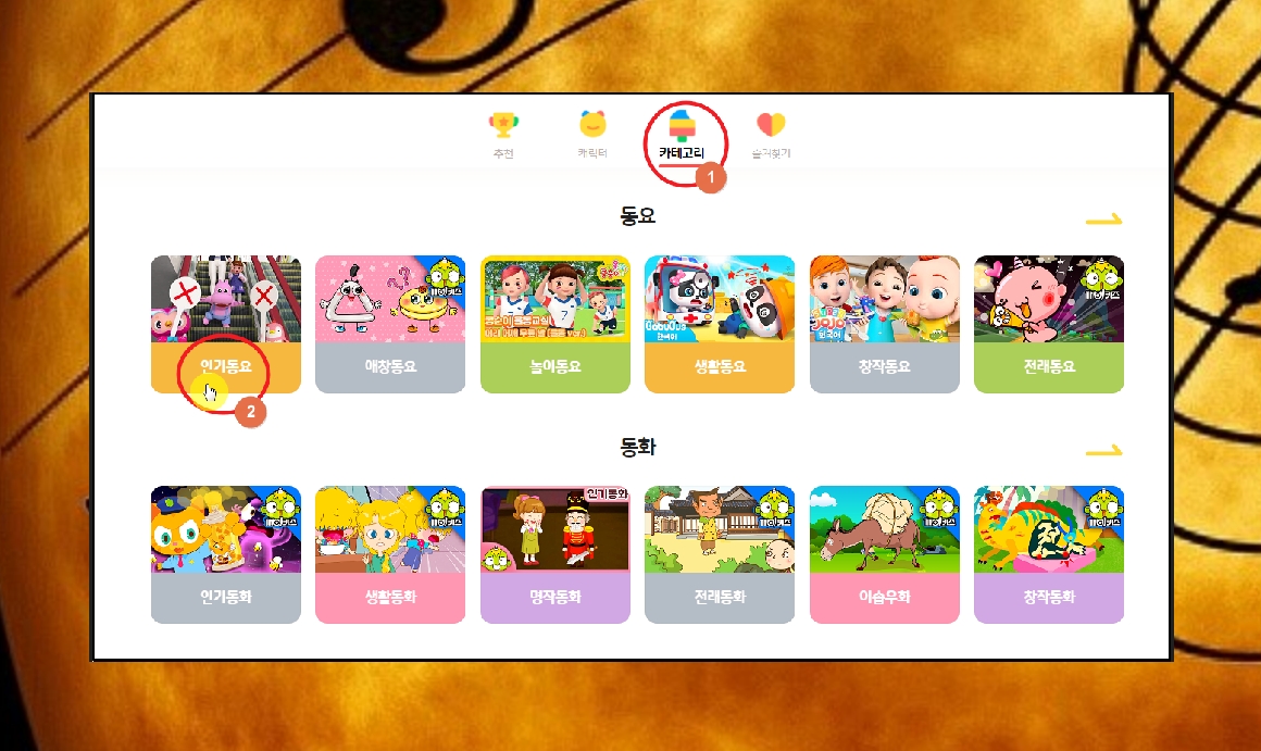 사이트에 접속하면 메뉴에서 [카테고리] 버튼을 클릭해 주세요. 참고로 이곳에서는 어린이들이 좋아하는 동화, TV동영상, 키즈엔터, 놀이학습, 플레이존과 같이 다양한 볼거리와 놀거리도 제공하고 있어요. 아이가 심심해 할 때 이곳의 무료 컨텐츠를 이용해 보세요. 그럼 동요를 선택해 보겠습니다.