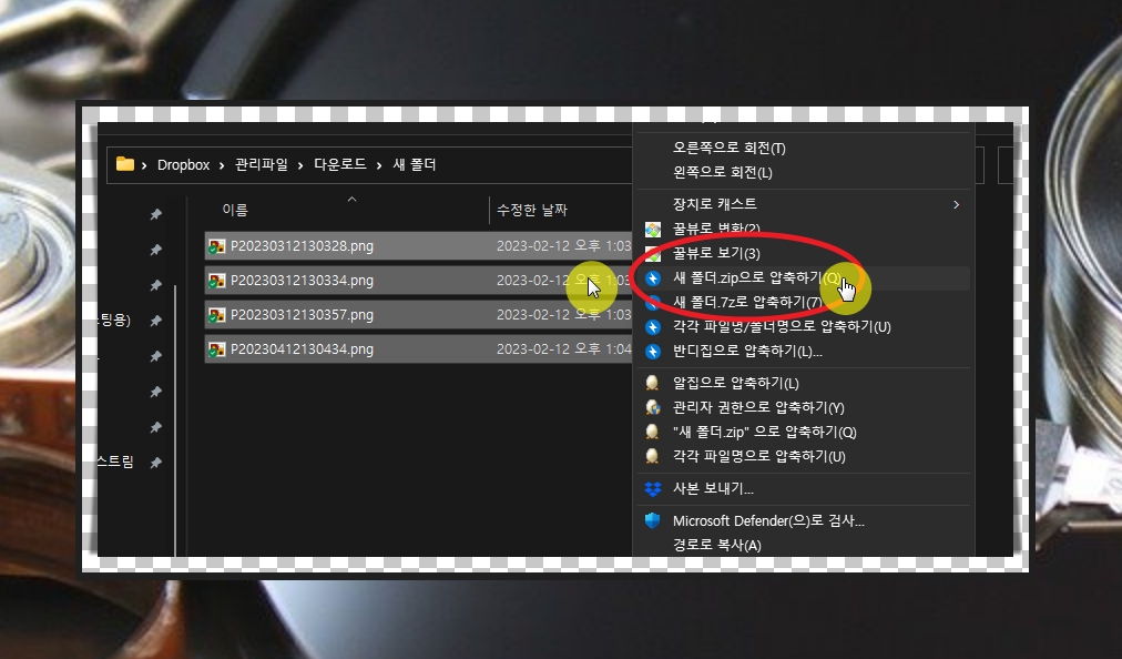 그럼 마우스 전용 메뉴가 나타나는데, 여기에서 [새 폴더.zip으로 압축하기]를 선택해 주세요.