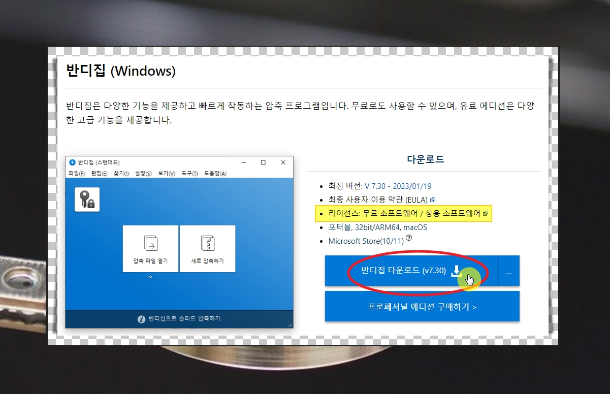 반디집 사이트에 접속하면 화면 오른편에 [반디집 다운로드] 버튼이 있습니다.