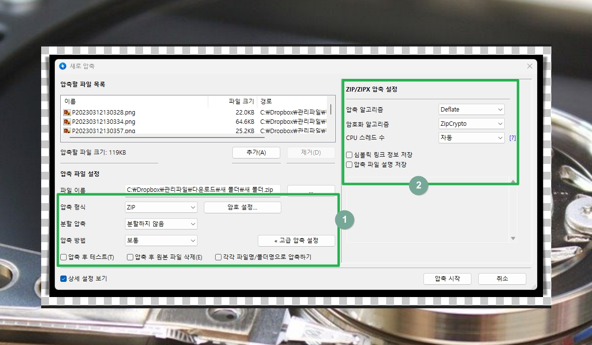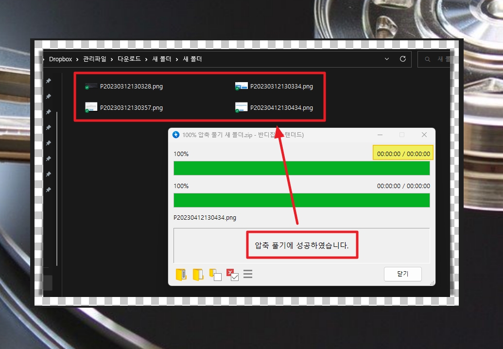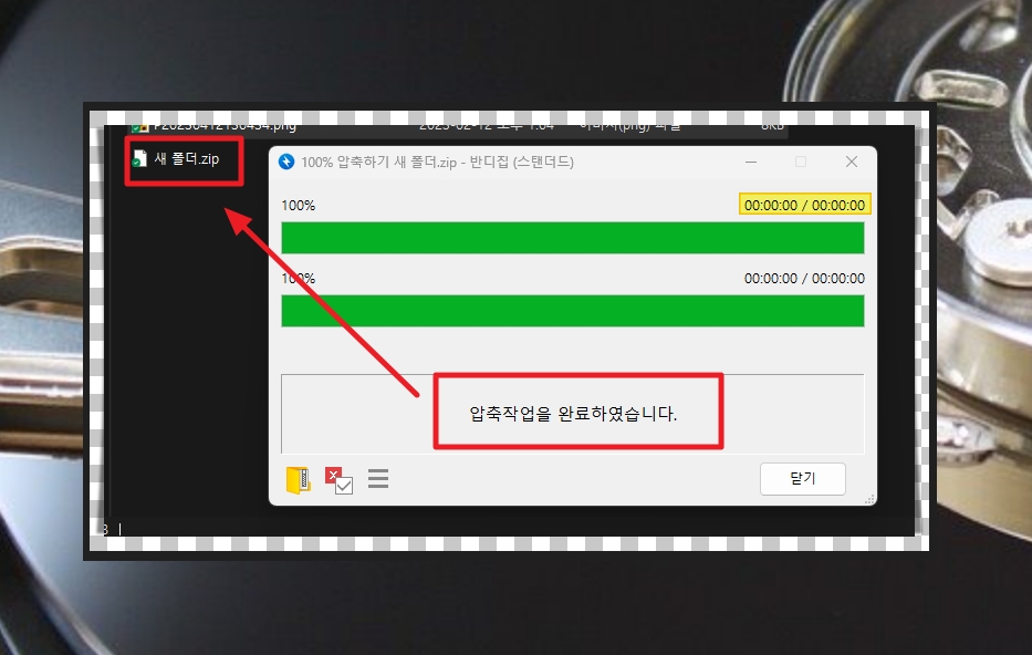 사용하는 컴퓨터와 대상 파일의 용량에 따라 압축하는 시간이 달라집니다.