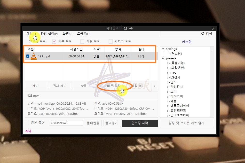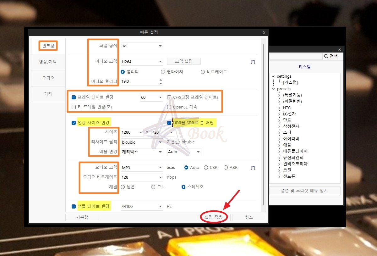 다음으로 [빠른 설정] 버튼을 눌러보세요. 그럼 어떻게 변환을 진행할 것인지 세부적인 설정값을 입력할 수 있는 창이 열립니다. 파일 형식, 비디오 코덱, 비디오 퀄리티, 플레임 레이트 관련, 영상 사이즈 관련, 샘플 레이트에 대한 설정 값을 원하는 것으로 수정한 후 [설정 적용] 버튼을 눌러주세요.