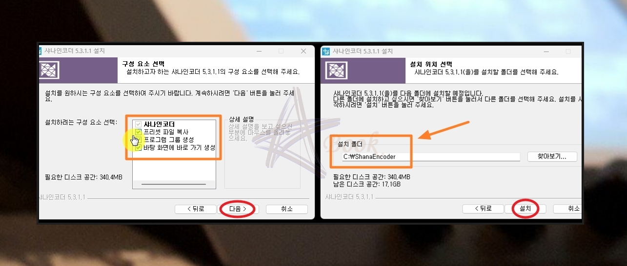 다음은 샤나인코더 동영상 변환 프로그램을 설치하는 화면입니다. [다음]과 [설치] 버튼을 누르면 될 정도로 설치는 어렵지 않은데요. 설치하려는 구성 요소를 선택하는 단계에서 "프리셋 파일 복사"를 체크하는 것이 좋습니다. 앞서 언급한 바와 같이 동영상 변환을 할 때 사용하기 편리한 설정값을 얻을 수 있기 때문이에요. 해당 인코더 프로그램은 용량을 얼마 차지하지 않기 때문에 설치 폴더는 크게 신경 쓰지 않아도 됩니다.