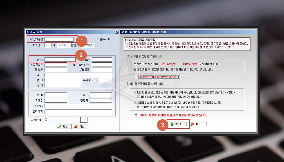 설치파일을 클릭하면 무료 회계 프로그램이 설치됩니다. 마지막 단계에서 위와 같은 화면이 나타나는데요. 회사 등록에서는 '회기/그룹명', '상호' 정도만 입력해도 됩니다. 회기연도 설정과 데이터 백업에 대한 확인도 꼼꼼히 해주시면 돼요.