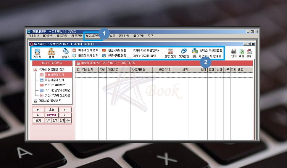 큐머니 메뉴에서 '부가세관리' 버튼을 누르면 다양한 매뉴가 나타나는데요. 세금신고는 회계에서 매우 중요한 부분입니다. 프로그램으로 간단하게 부가세와 계산서를 정리해보세요. 담당자에게 꼭 필요한 기능입니다.