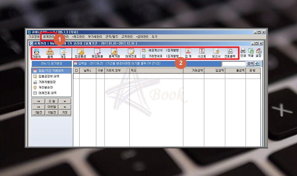 보시는 바와 간이 회계를 관리하거나 세무 및 경리부의 업무를 진행할 수 있는 버튼이 나옵니다. 거래처, 품목, 계정은 관리를 위한 것이고, 입금출금, 매입매출, 품목거래, 대체전표는 경리할 때 쓰이겠죠? 세금계산서와 거래명세표 등은 회계에 꼭 필요한 것들입니다.