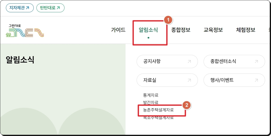 "그린대로" 사이트에 접속했습니다. 이곳에서는 귀농귀촌을 하고 싶은 사람들에게 유익한 정보와 자료 그리고 다양한 서비스를 제공하는 곳이에요. 자료실 페이지로 이동하기 위해 메뉴에 있는 [알림소식]과 [자료실] 그리고 [농촌주택 설계자료]를 차례대로 클릭해 주세요.