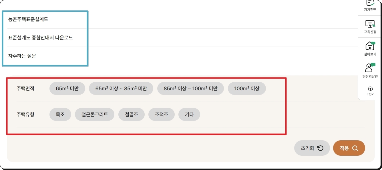 설명서 내용을 읽은 후에는 마음에 드는 전원주택 모델을 찾아야 하는데요. 주택의 면적과 유형 조건을 설정하면 좀 더 쉽게 원하는 모델을 찾을 수 있습니다. 주택의 유형으로는 목조, 철근콘크리트, 조적조, 철골조, 기타를 선택할 수 있어요.