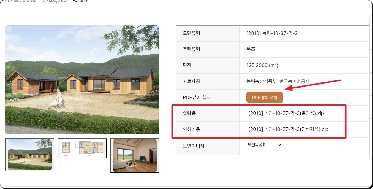 전원주택 모델을 선택하면 설계도면 파일을 다운로드 받을 수 있는 페이지가 열렸는데요. 여기서 받는 자료는 zip 파일로 압축이 되어 있습니다.
